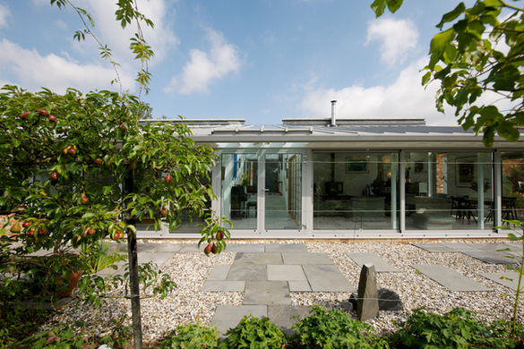 The initial concept was to expand and refurbish the original greenhouse dating back to the late part of the 19th Century. In the end, only the listed wall running through the spine of the building was retained. The greenhouse was sensitively taken apart and elements were incorporated in the new construction. The end product was a 200 sq m new dwelling, set within a mature garden, incorporating full height triple glazed units in the south-facing elevation, a ground source heat-pump, an air recycling system and photovoltaic panels on the south face of the roof.